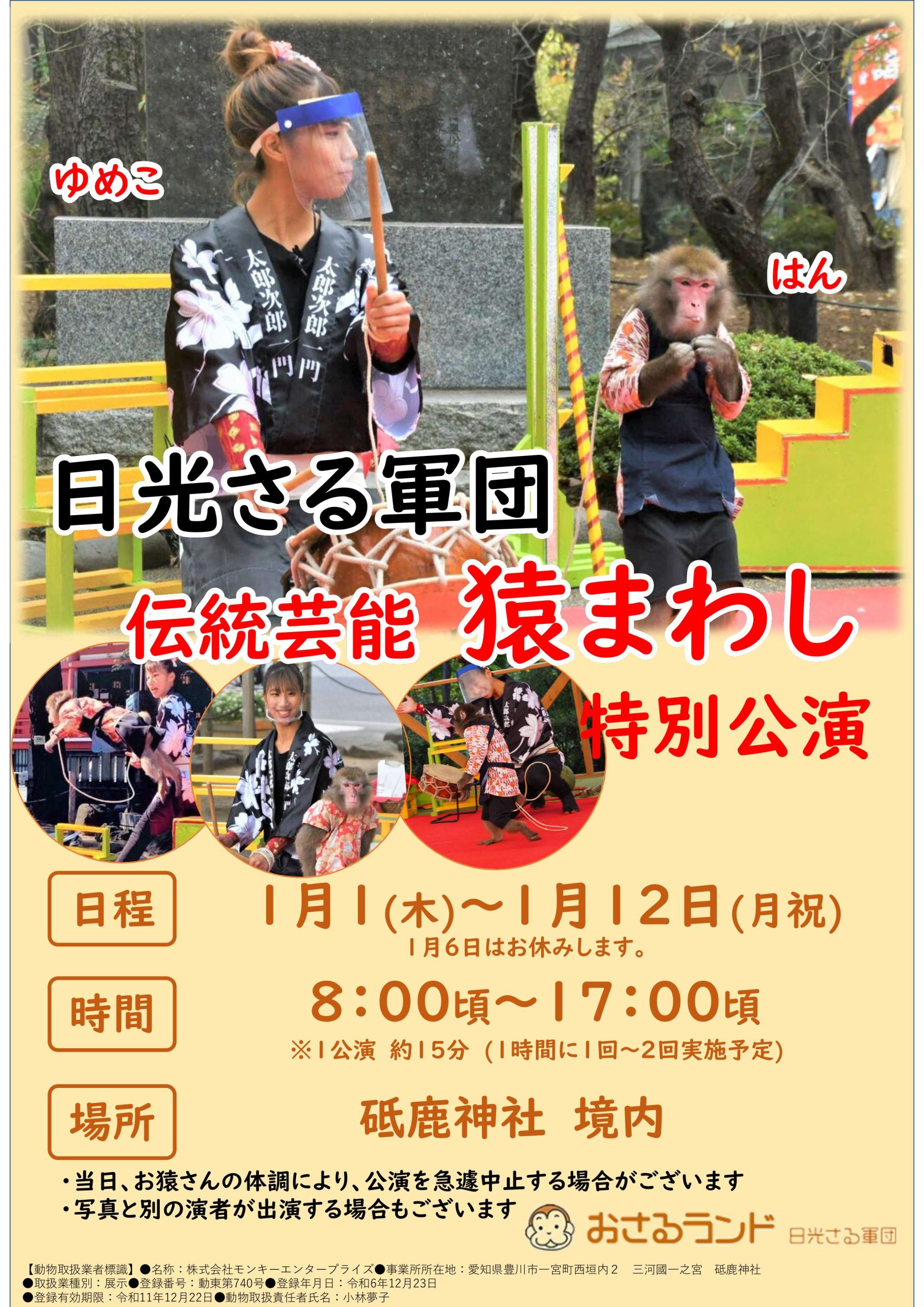 1/1(木)〜1/12(月・祝)の間、日光さる軍団による伝統芸能「猿まわし」が砥鹿神社境内にて特別公演されます。※1/6はお休みとなります。